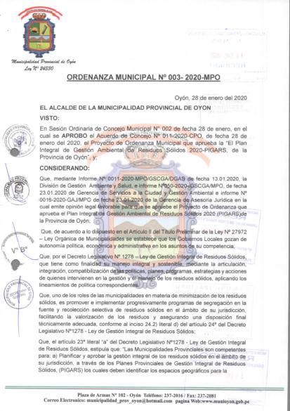 Ordenanza que aprueba el Plan Integral de Gestión Ambiental de Residuos Solidos 2020-(PIGARS) de la Provincia de Oyon