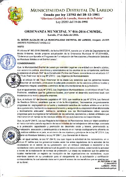 Ordenanza que aprueba el Programa de Formalización de Recicladores y Recolección Selectiva de Residuos Sólidos en el Distrito Laredo