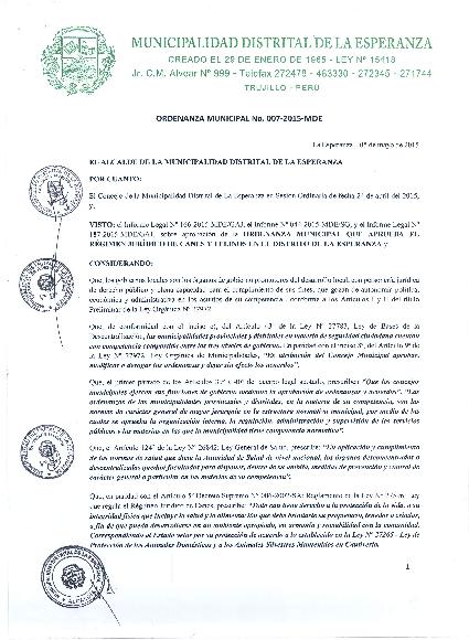 Ordenanza que aprueba el régimen jurídico de canes y felinos en el distrito La Esperanza
