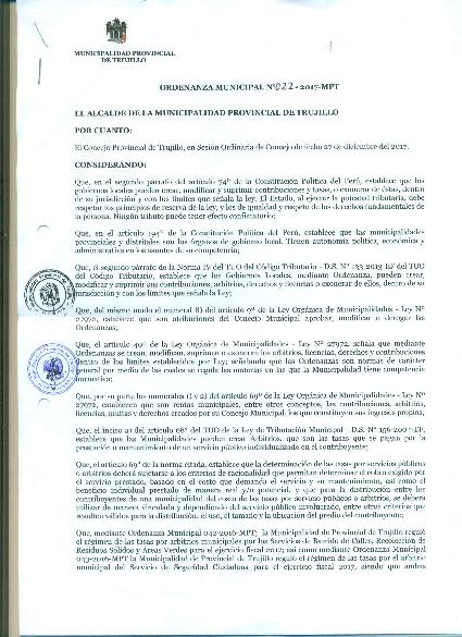 Ordenanza que Aprueba el Régimen Legal de Arbitrios de Barrido de Calles, Recolección de Residuos Sólidos, Áreas Verdes y Seguridad Ciudadana del Distrito de Trujillo para el Ejercio Fiscal 2018.