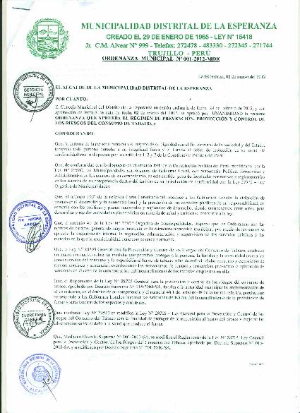 Ordenanza que aprueba el régimen de prevención, protección y control de los riesgos del consumo de tabaco en el distrito de La Esperanza