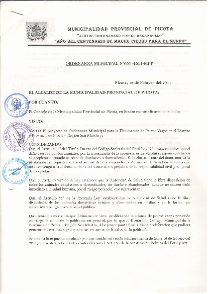Ordenanza que Aprueba el Reglamento para la Eliminación de Perros Vagos en el Distrito de Picota - Provincia de Picota - Region San Martín.