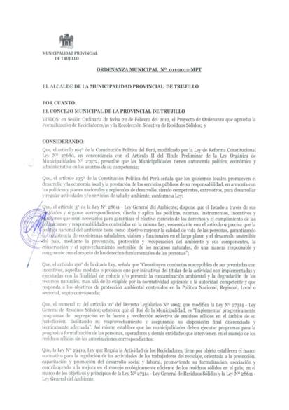 Con la Ordenanza Municipal Nº 011-2012-MPT se aprueba el "Reglamento de Formalización de Recicladores y Recolección Selectiva de Residuos Sólidos en el Distrito de Trujillo el mismo que en anexo forma parte de la presente Ordenanza y que consta de 34 artículos, 05 disposiciones finales y transitorias, y 12 anexos. El cumplimiento de la presente ordenanza se encarga al SEGAT en coordinación con la Gerencia de Desarrollo Económico Local, Gerencia de Seguridad Ciudadana y Defensa Civil, Subgerencia de Salud, Cooperación Técnica y Agencias de Desarrollo, la Dirección Ejecutiva de Salud Ambiental y la Dirección de Red de Salud de Trujillo.