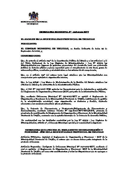 Ordenanza que aprueba el reglamento de organización y funciones - ROF de la Municipalidad Provincial de Trujillo