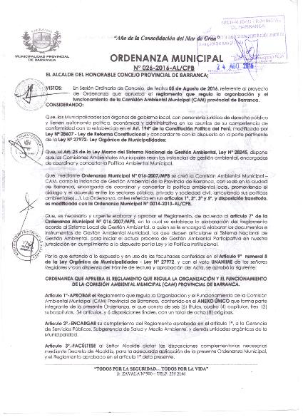 Ordenanza que aprueba el Reglamento que regula la organización y el funcionamiento de la Comisión Ambiental Municipal (CAM) Provincial de Barranca