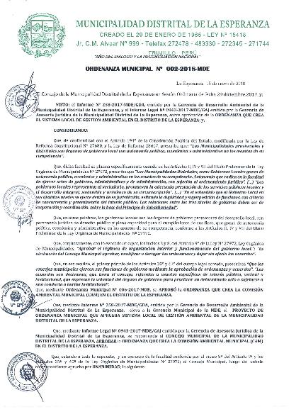 Ordenanza que Crea el Sistema Local de Gestión Ambiental en el Distrito de La Esperanza.