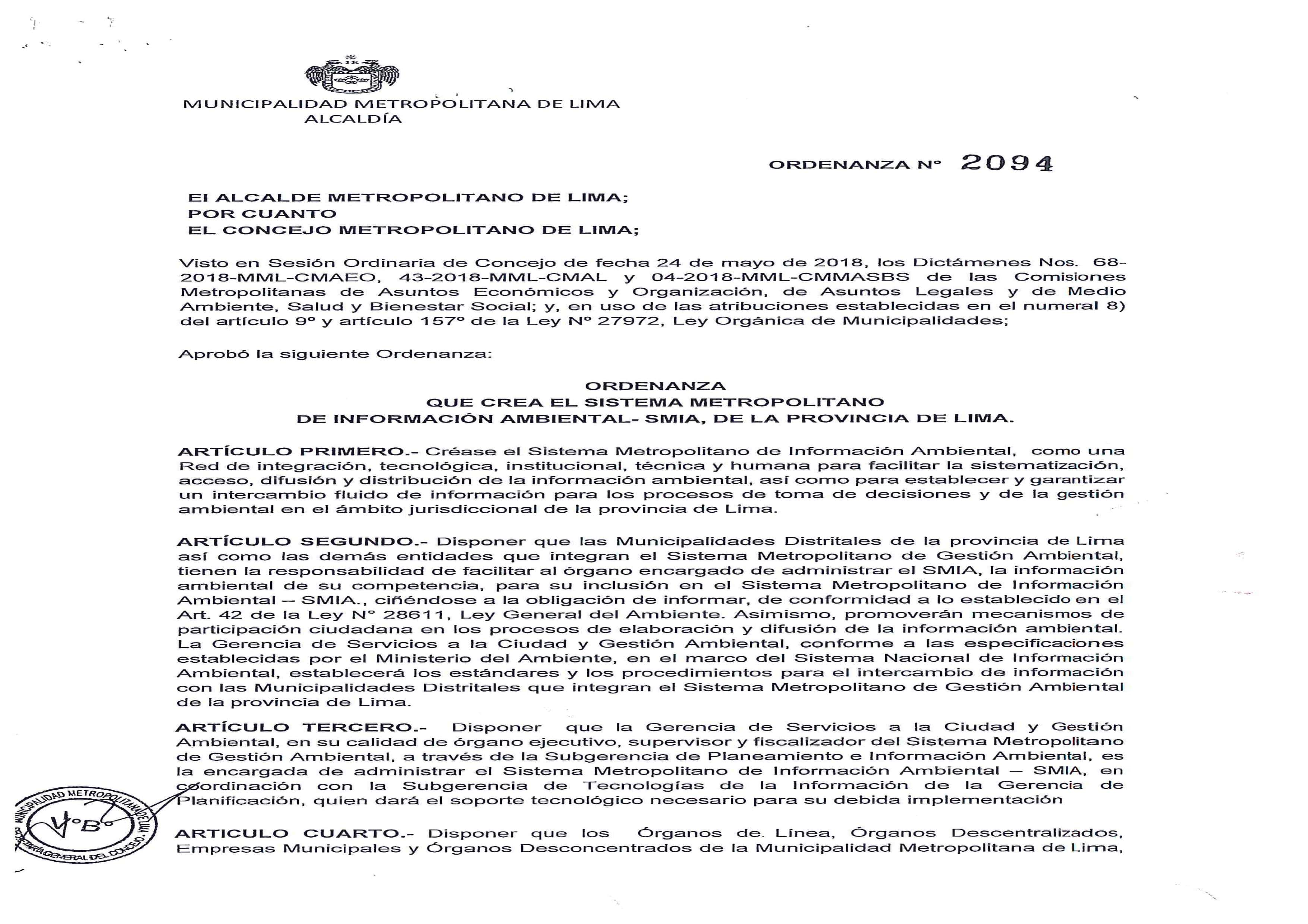 La presente Ordenanza crea el Sistema Metropolitano de Información Ambiental, como una red de integración tecnológica, institucional, técnica y humana para facilitar la sistematización, acceso, difusión y distribución de información ambiental, así como para establecer y garantizar un intercambio fluido de información para los procesos de toma de decisiones y de la gestión ambiental en la provincia de Lima.