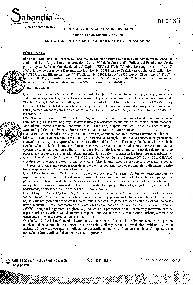 La presente Ordenanza declara el reconocimiento del árbol patrimonial denominado "El Abuelo" del sector El Molino de Sabandía, con registro n° 001-2020-MDS, ubicado en el distrito de Sabandía, provincia de Arequipa, departamenteo de Arequipa.