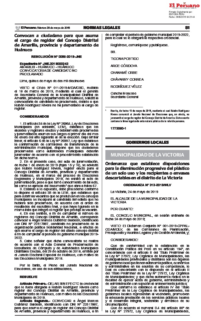 Ordenanza que establece disposiciones para la disminución progresiva del plástico de un solo uso y los recipientes o envases descartables en el distrito de La Victoria