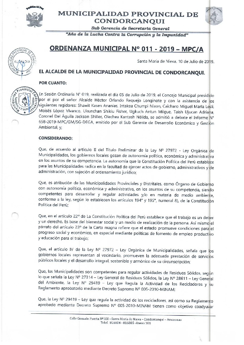 Ordenanza que establece la formalización de los segregadores de residuos sólidos de la provincia de Condorcanqui