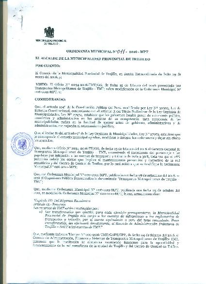 Ordenanza que modifica la Ordenanza Municipal N° 026-2011-MPT, el inciso a) del artículo 15° de la siguiente manera: Las transferencias que efectúa, para cada ejercicio presupuestario, la Municipalidad Provincial de Trujillo con cargo a las cuentas de infracciones a los reglamentos de transportes y tránsito, por el monto equivalente a 36% del total recaudado. Estas transferencias, las efectuará directamente, el Servicio de Administración Tributaria a las cuentas de Transporte Metropolitano de Trujillo.