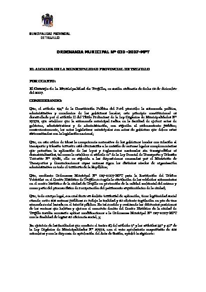 Ordenanza que modifica la Ordenanza Municipal Nº 027-2007-MPT que regula la restricción del tránsito vehicular en el Centro Histórico de Trujillo