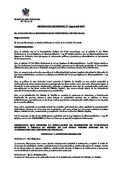 Ordenanza que prohíbe la instalación de elementos de publicidad exterior y regula su retiro de las áreas verdes dentro de la jurisdicción del distrito de Trujillo