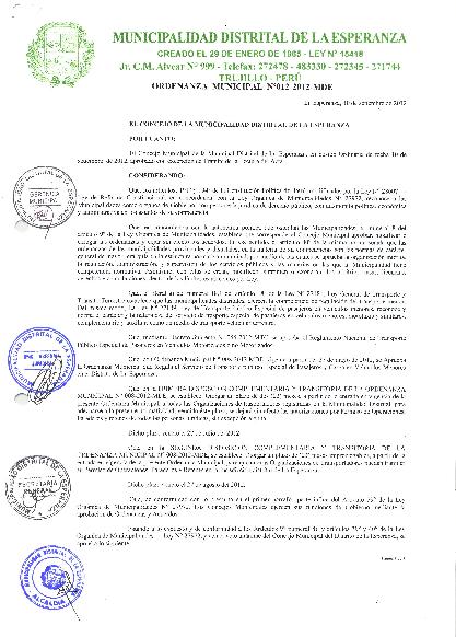 Ordenanza que prorroga el plazo de la primera y segunda disposición complementaria y transitoria de la Ordenanza Municipal N° 008-2012-MDE, Ordenanza que regula el servicio de transporte público especial de pasajeros y carga en vehículos menores en el distrito de La Esperanza. El plazo de la primera y la segunda disposición complementaria y transitoria, se amplía hasta el 31 diciembre del 2012.