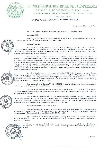 Ordenanza que aprueba, la prórroga de plazo consignada en la Segunda disposición complementaria y transitoria de la Ordenanza Municipal N° 008-2012-MDE que regula el servicio de transporte público especial de pasajeros y carga en vehículos menores en el distrito de La Esperanza y de la Ordenanza Municipal N° 012-2012-MDE que prorroga el plazo de la primera y segunda disposición complementaria y transitoria de la Ordenanza Municipal N° 008-2012-MDE.