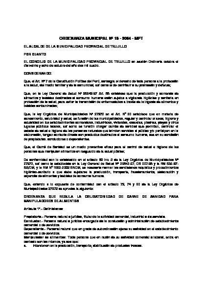 Mediante esta ordenanza se dispone la obligatoriedad de contar con el Carné de Sanidad en la jurisdicción de Trujillo, como documento personal e intransferible a todas aquellas personas naturales que están consideradas como manipuladores de Alimentos, y que por la naturaleza de sus labores tienen contacto directo con productos destinados al consumo humano y/o con el público en general, sea en la condición de propietario, conductor o dependiente de establecimiento comercial o de servidos, público o privado, con la finalidad de salvaguardar el derecho que tiene todo miembro de la comunidad a la protección de su salud.