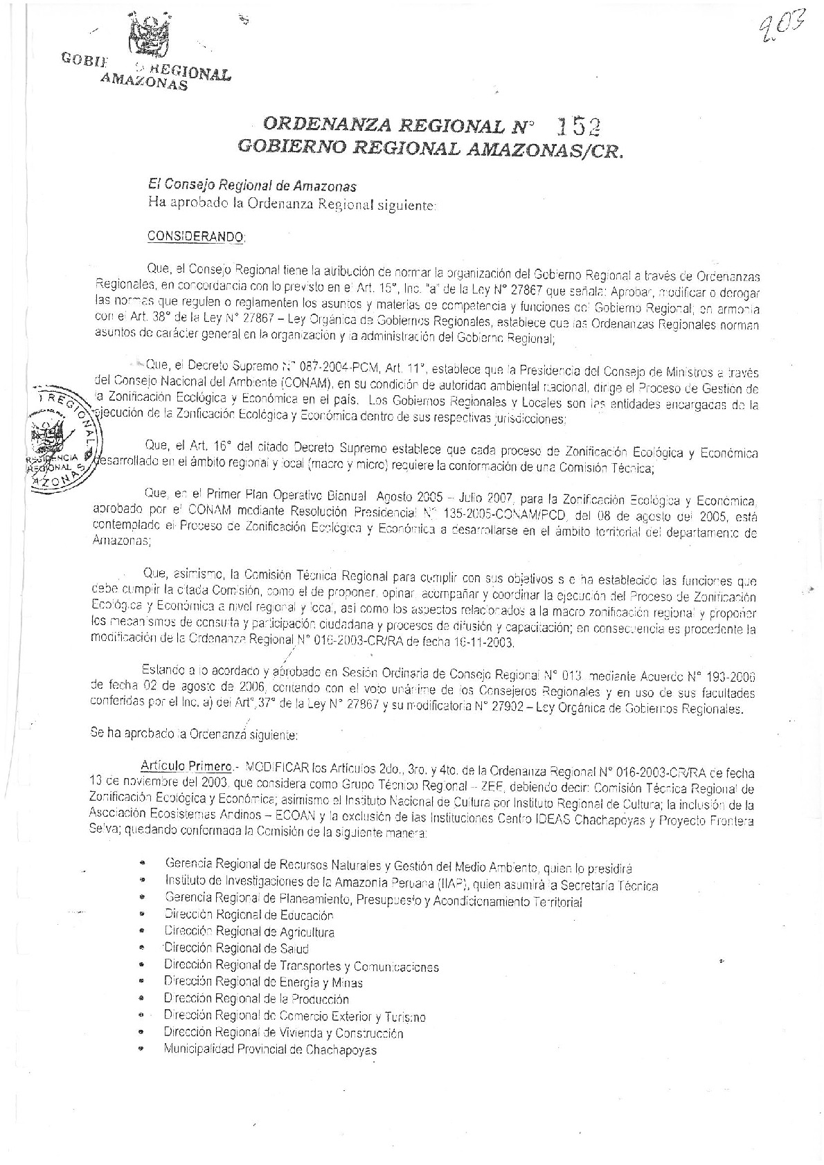 Modificar el Artículo 2do. 3ro y 4to de la Ordenanza Regional N| 016-2003 CR/RA de feche 13 de noviembre del 2003, que considera como grupo Técnico Regional-ZEE, debiendo de3cir Comisión Técnica Regional de Zonificaión Ecológica y Economica.