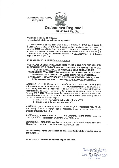 Modifica la O.R. 411 que apruaba el TUPA del GRA e incorpora procedimientos administrativos del sector Transportes