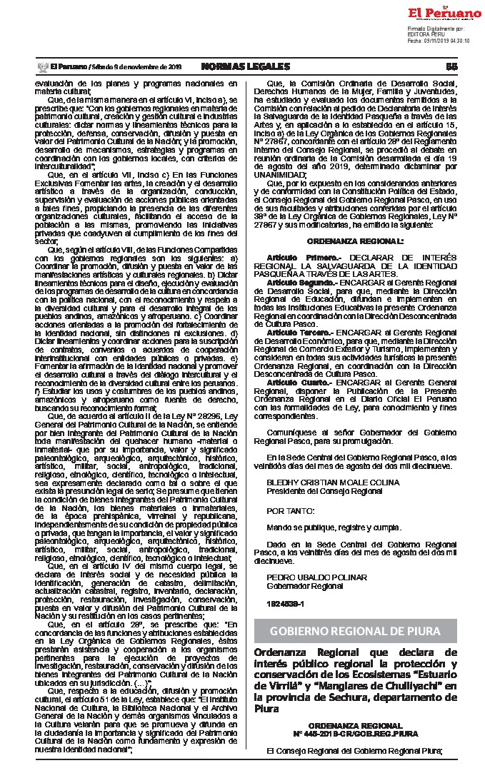 Ordenanza Regional que declara de interés público regional la protección y conservación de los Ecosistemas “Estuario de Virrilá” y “Manglares de Chulliyachi” en la provincia de Sechura, departamento de Piura