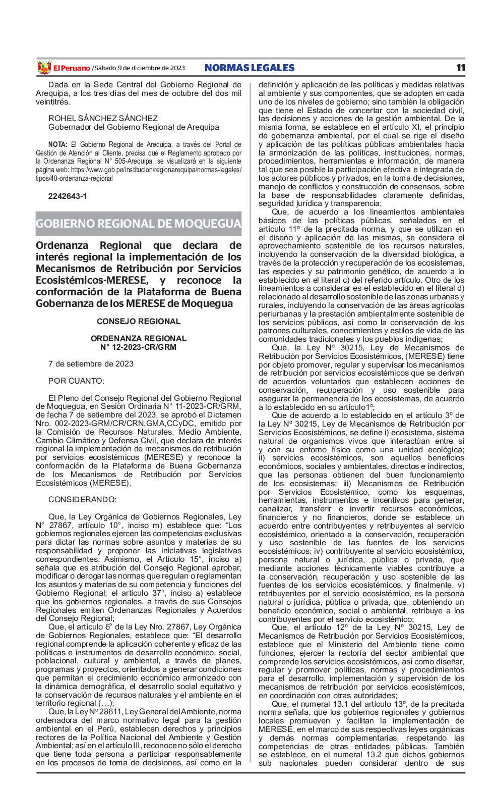 La Ordenanza Regional declara de Interés Regional la Implementación de los Mecanismos de Retribución por Servicios Ecosistémicos (MERESE) en el ámbito del departamento de Moquegua, que permita generar, canalizar, invertir, promover acuerdos voluntarios y