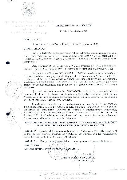 Ordenanza de Reglamento de Saneamiento Ambiental y Control Sanitario en el Distrito de San Vicente, Provincia de Cañete