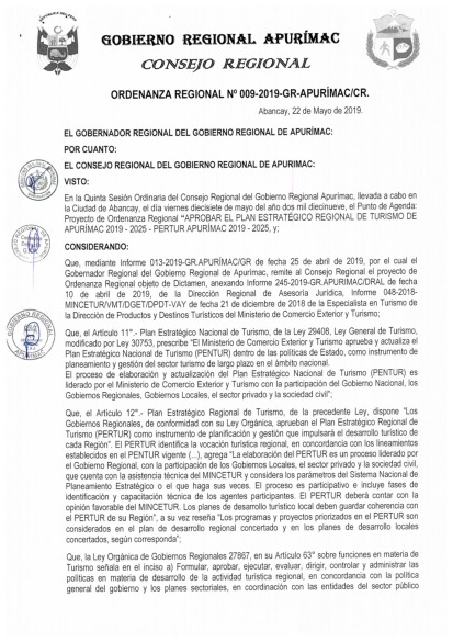 ARTICULO PRIMERO.- APROVAR el Plan Estratégico Regional de Turismo de Apurímac 2019-2025-PERTUR APURIMAC 2019-2025, como instrumento de panificación y gestión, que establece los lineamientos para el desarrollo de la actividad turística, que en anexo forma parte integrante de la presente Ordenanza Regional