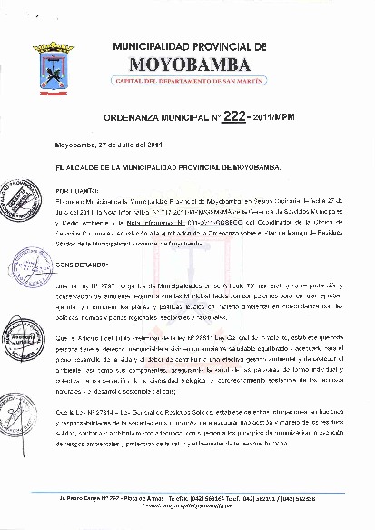 Esta orientado a promover la educacion ambiental, para la participacion de la ciudadania en el manejo de los residuos solidos con buenas practicas en el cuidado del ambiente de la Provincia de Moyobamba.