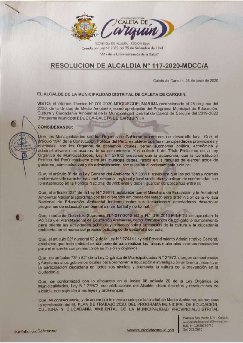 La presente Resolución aprueba el Plan de Trabajo 2020 del Programa Municipal de Educación, Cultura y Ciudadanía Ambiental de la Municipalidad Distrital de Caleta de Carquín– HUAURA (LIMA); con la finalidad de definir las actividades de educación, cultura y ciudadanía ambiental que se desarrollarán en la localidad durante el presente año.