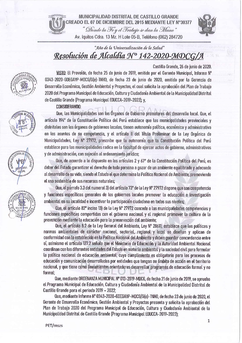 La presente Resolución aprueba el Plan de Trabajo 2020 del Programa Municipal de Educación, Cultura y Ciudadanía Ambiental de la Municipalidad Distrital de Castillo Grande, con la finalidad de definir las actividades de educación, cultura y ciudadanía ambiental que se desarrollarán en la localidad durante el presente año.