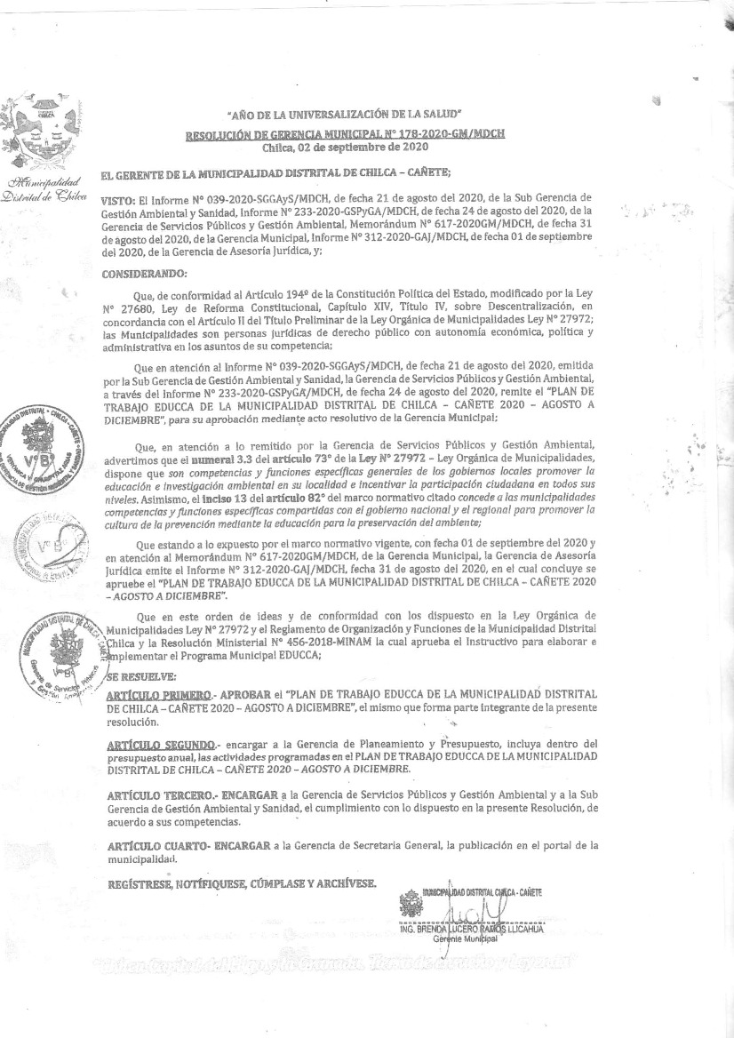 La presente Resolución aprueba el Plan de Trabajo 2020 del Programa Municipal de Educación, Cultura y Ciudadanía Ambiental de la Municipalidad Distrital de Chilca, con la finalidad de definir las actividades de educación, cultura y ciudadanía ambiental que se desarrollarán en la localidad durante el presente año.
