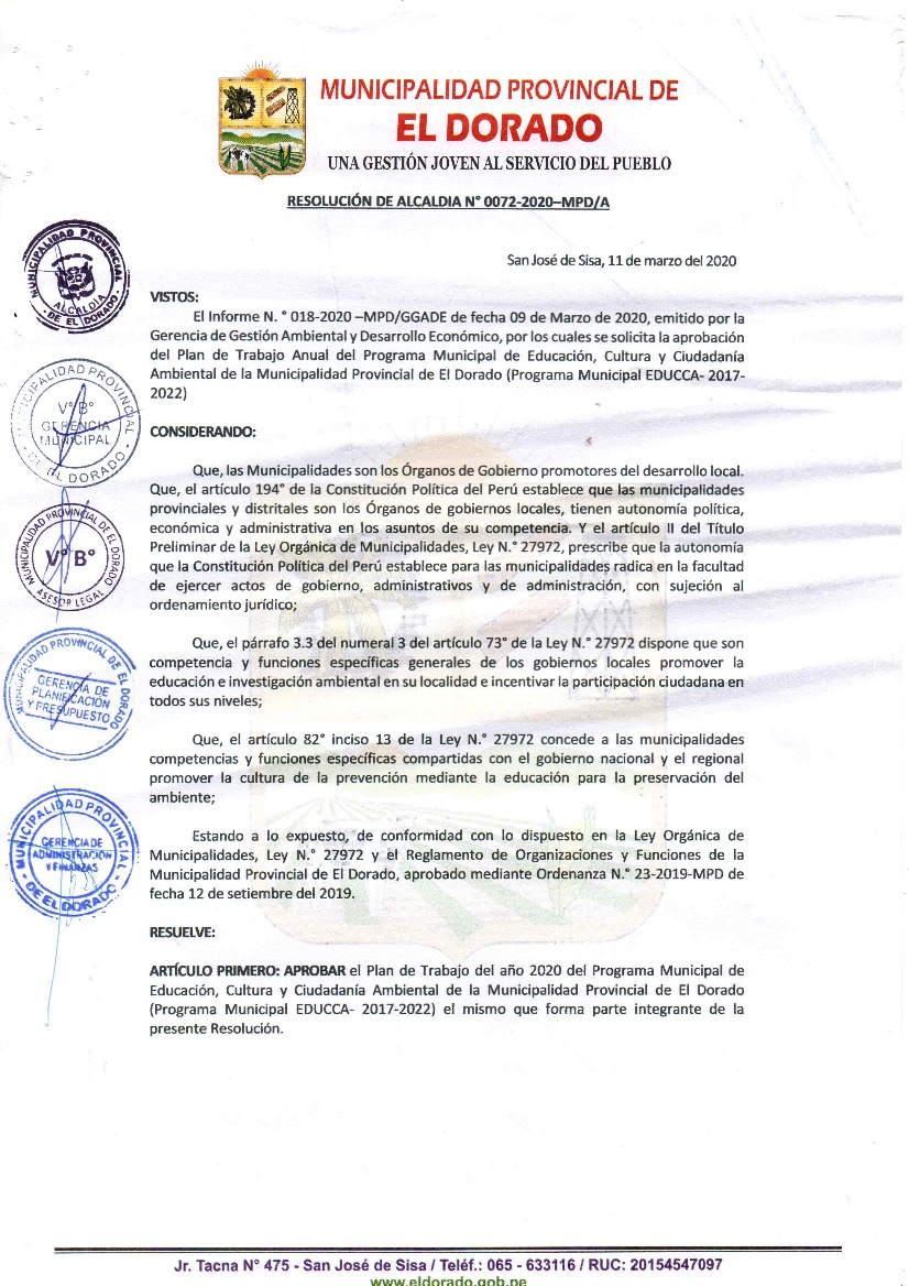 La presente Resolución aprueba el Plan de Trabajo 2020 del Programa Municipal de Educación, Cultura y Ciudadanía Ambiental de la Municipalidad Provincial de El Dorado, con la finalidad de definir las actividades de educación, cultura y ciudadanía ambiental que se desarrollarán en la localidad durante el presente año.
