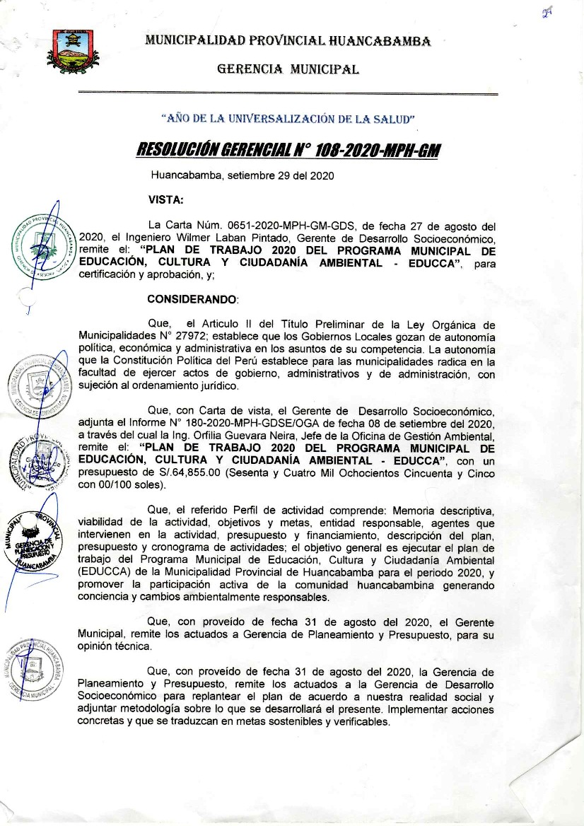 La presente Resolución aprueba el Plan de Trabajo 2020 del Programa Municipal de Educación, Cultura y Ciudadanía Ambiental de la Municipalidad Provincia de Huancabamba, con la finalidad de definir las actividades de educación, cultura y ciudadanía ambiental que se desarrollarán en la localidad durante el presente año.