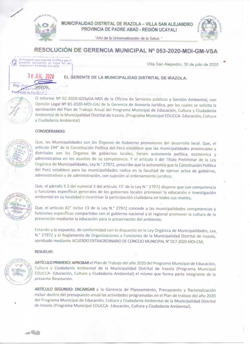 La presente Resolución aprueba el Plan de Trabajo 2020 del Programa Municipal de Educación, Cultura y Ciudadanía Ambiental de la Municipalidad Distrital de Irazola, con la finalidad de definir las actividades de educación, cultura y ciudadanía ambiental que se desarrollarán en la localidad durante el presente año.