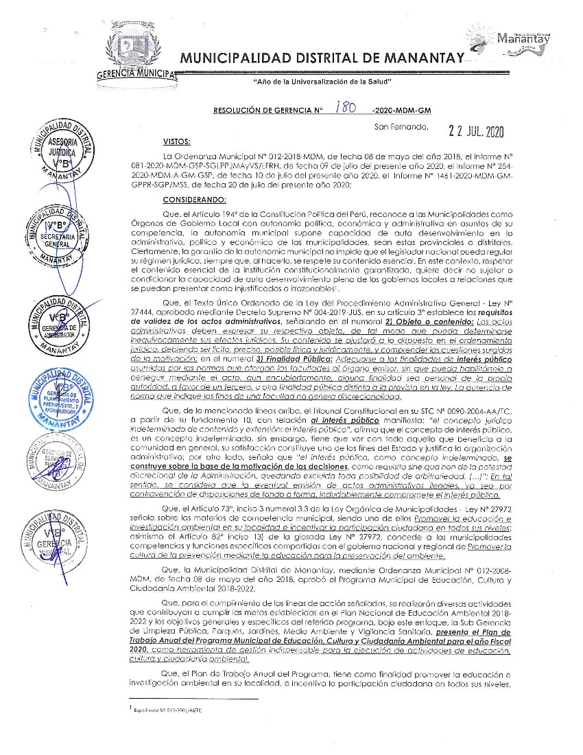 La presente Resolución aprueba el Plan de Trabajo 2020 del Programa Municipal de Educación, Cultura y Ciudadanía Ambiental de la Municipalidad Distrital de Manantay, con la finalidad de definir las actividades de educación, cultura y ciudadanía ambiental que se desarrollarán en la localidad durante el presente año.