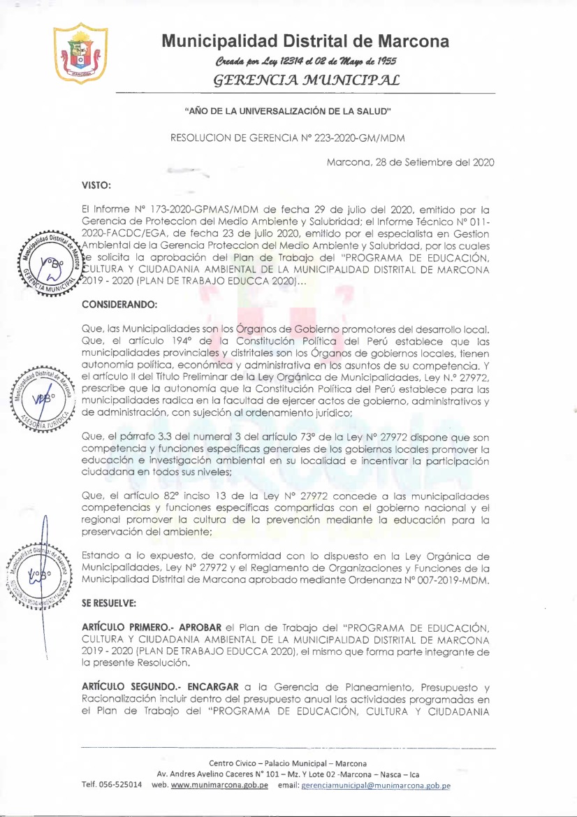 La presente Resolución aprueba el Plan de Trabajo 2020 del Programa Municipal de Educación, Cultura y Ciudadanía Ambiental de la Municipalidad Distrital de Marcona, con la finalidad de definir las actividades de educación, cultura y ciudadanía ambiental que se desarrollarán en la localidad durante el presente año.