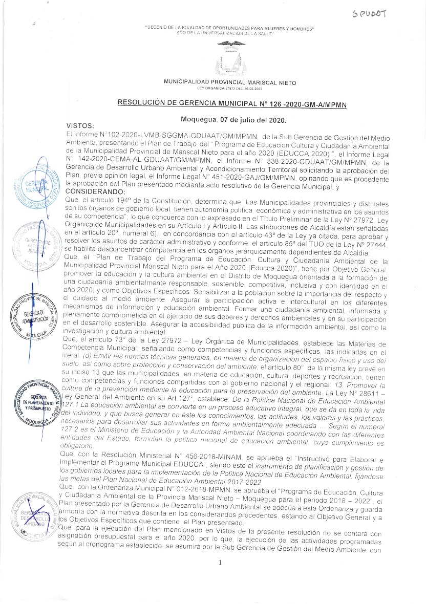 La presente Resolución aprueba el Plan de Trabajo 2020 del Programa Municipal de Educación, Cultura y Ciudadanía Ambiental de la Municipalidad Provincial de Mariscal Nieto con la finalidad de definir las actividades de educación, cultura y ciudadanía ambiental que se desarrollarán en la localidad durante el presente año.