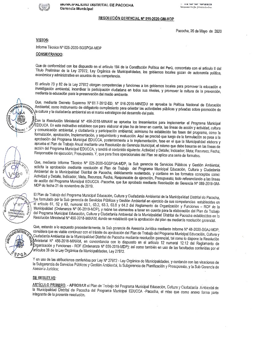 La presente Resolución aprueba el Plan de Trabajo 2020 del Programa Municipal de Educación, Cultura y Ciudadanía Ambiental de la Municipalidad Distrital de Pacocha, con la finalidad de definir las actividades de educación, cultura y ciudadanía ambiental que se desarrollarán en la localidad durante el presente año.