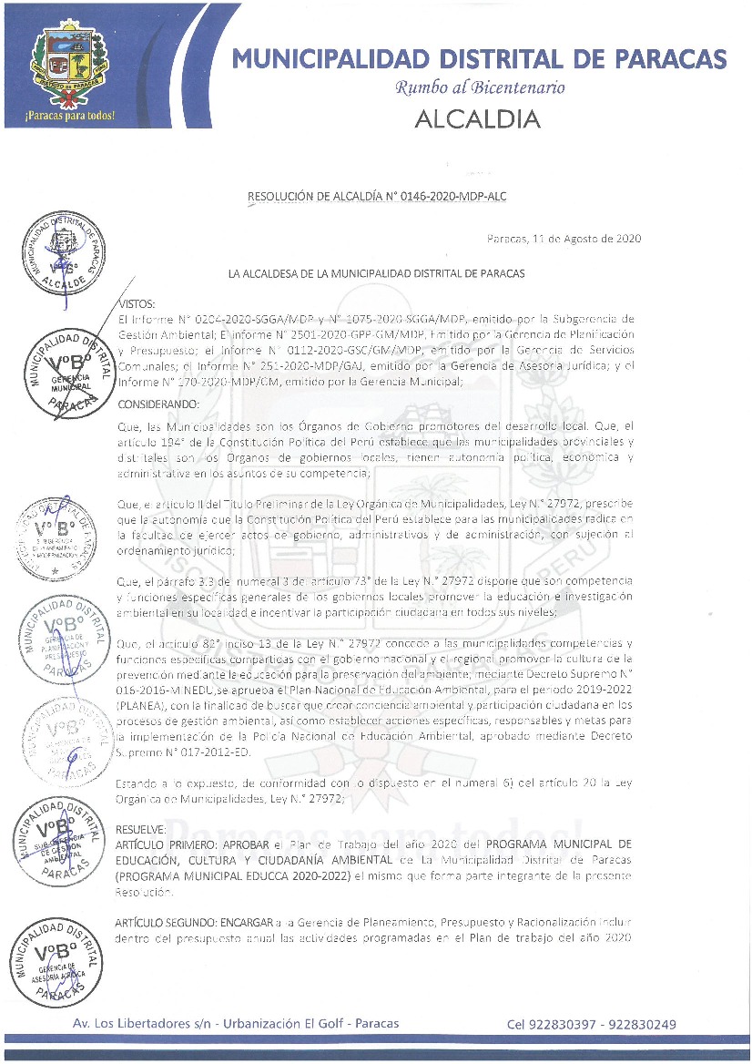 La presente Resolución aprueba el Plan de Trabajo 2020 del Programa Municipal de Educación, Cultura y Ciudadanía Ambiental de la Municipalidad Distrital de Paracas, con la finalidad de definir las actividades de educación, cultura y ciudadanía ambiental que se desarrollarán en la localidad durante el presente año
