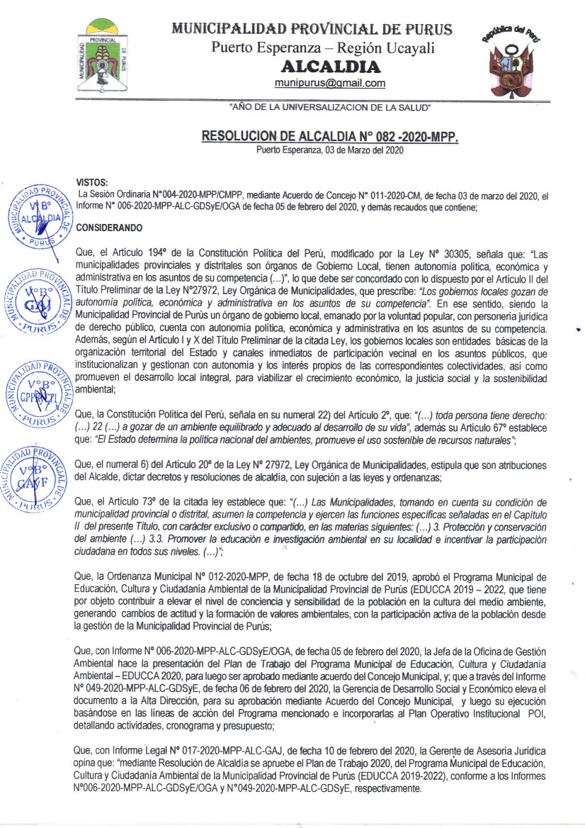 La presente Resolución aprueba el Plan de Trabajo 2020 del Programa Municipal de Educación, Cultura y Ciudadanía Ambiental de la Municipalidad Provincia de Purús, con la finalidad de definir las actividades de educación, cultura y ciudadanía ambiental que se desarrollarán en la localidad durante el presente año.