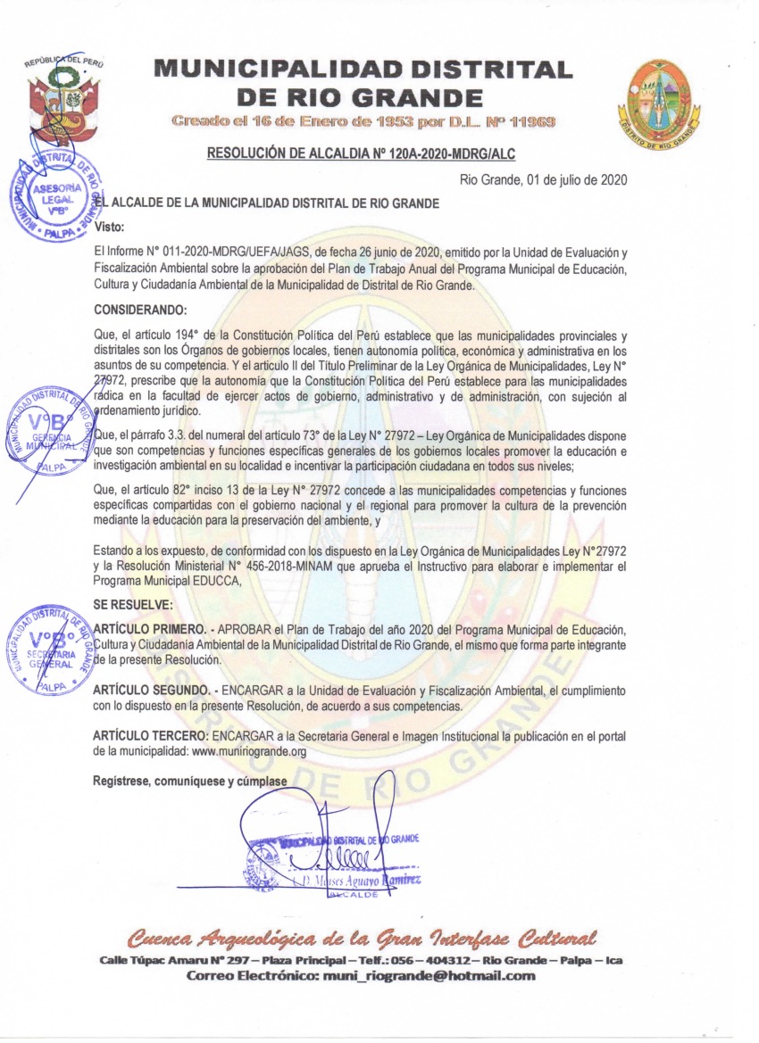 La presente Resolución aprueba el Plan de Trabajo 2020 del Programa Municipal de Educación, Cultura y Ciudadanía Ambiental de la Municipalidad Distrital de Río Grande, con la finalidad de definir las actividades de educación, cultura y ciudadanía ambiental que se desarrollarán en la localidad durante el presente año.