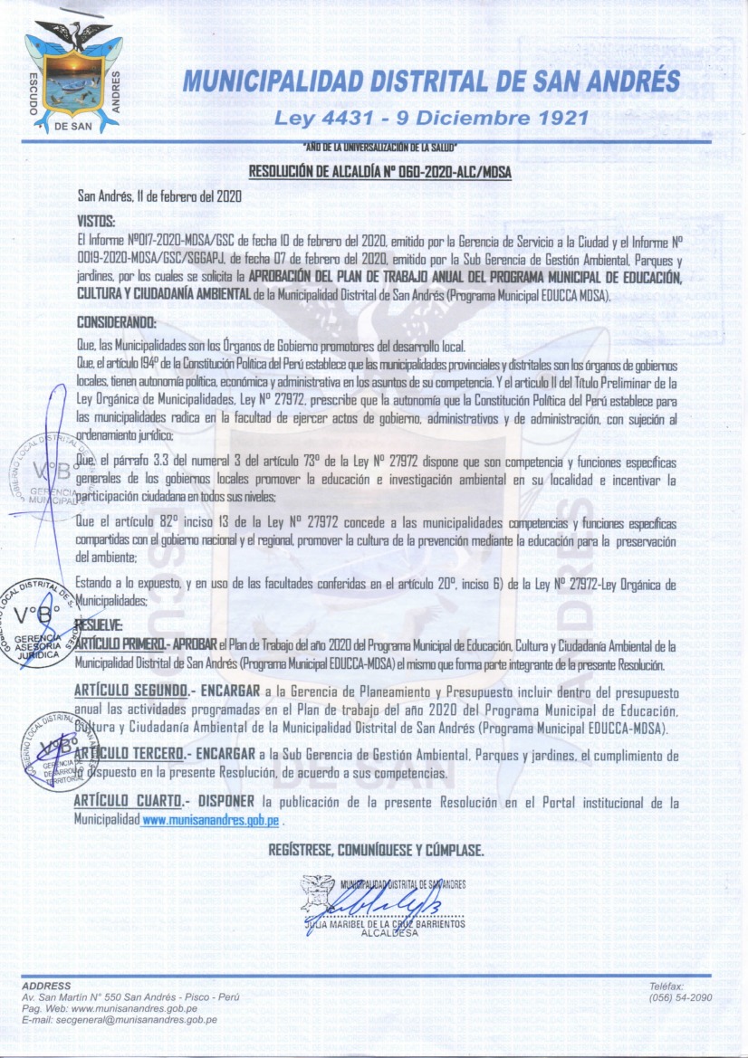 La presente Resolución aprueba el Plan de Trabajo 2020 del Programa Municipal de Educación, Cultura y Ciudadanía Ambiental de la Municipalidad Distrital de San Andrés– PISCO (ICA); con la finalidad de definir las actividades de educación, cultura y ciudadanía ambiental que se desarrollarán en la localidad durante el presente año.