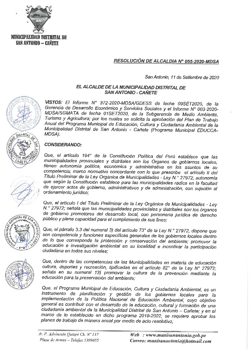 La presente Resolución aprueba el Plan de Trabajo 2020 del Programa Municipal de Educación, Cultura y Ciudadanía Ambiental de la Municipalidad Distrital de San Antonio, con la finalidad de definir las actividades de educación, cultura y ciudadanía ambiental que se desarrollarán en la localidad durante el presente año.
