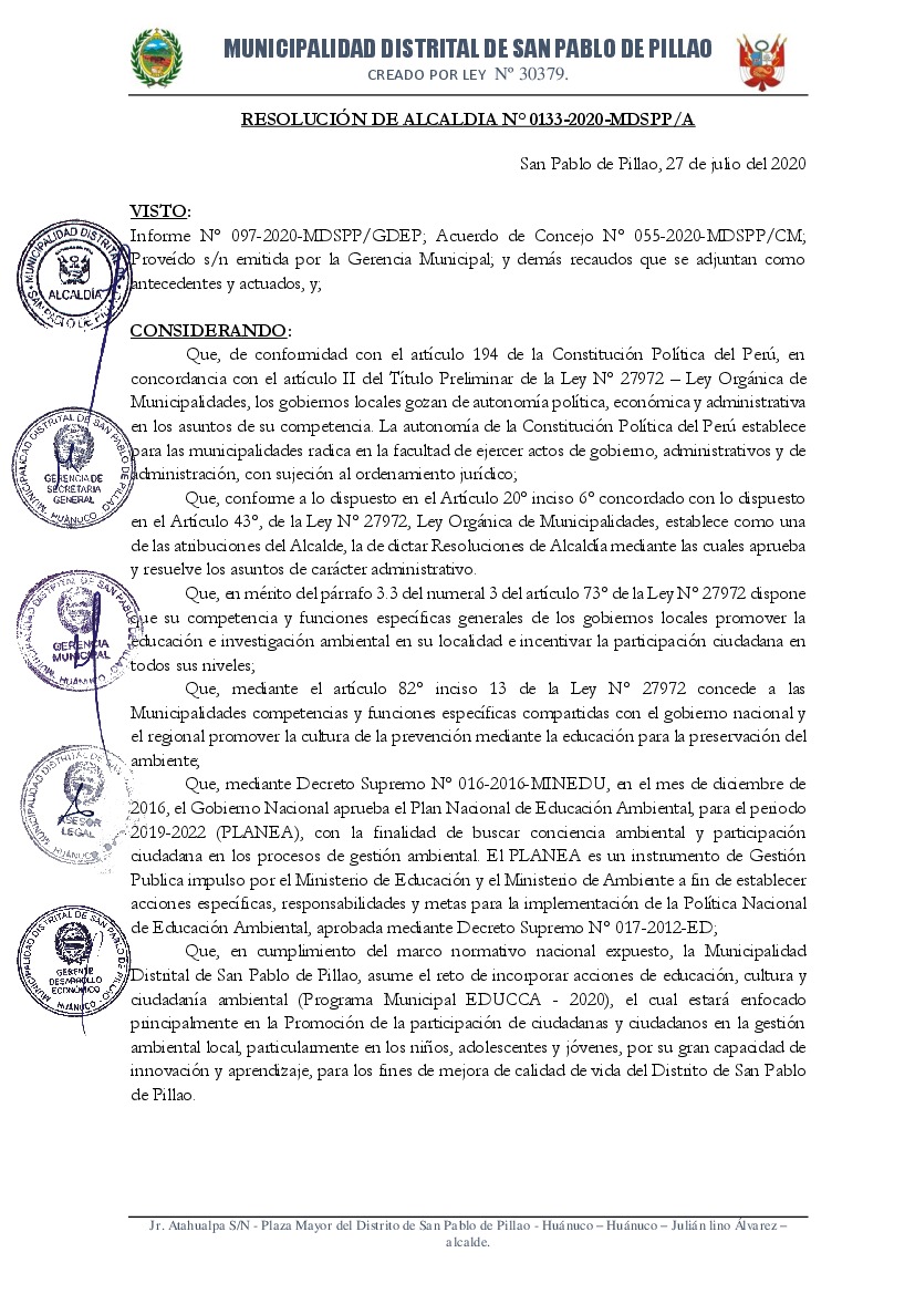 La presente Resolución aprueba el Plan de Trabajo 2020 del Programa Municipal de Educación, Cultura y Ciudadanía Ambiental de la Municipalidad Distrital de San Pablo de Pillao, con la finalidad de definir las actividades de educación, cultura y ciudadanía ambiental que se desarrollarán en la localidad durante el presente año.