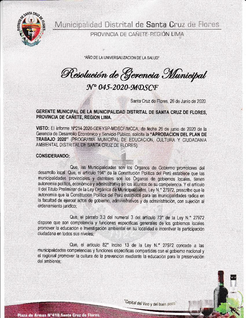 La presente Resolución aprueba el Plan de Trabajo 2020 del Programa Municipal de Educación, Cultura y Ciudadanía Ambiental de la Municipalidad Distrital de Santa Cruz de Flores– CAÑETE (LIMA); con la finalidad de definir las actividades de educación, cultura y ciudadanía ambiental que se desarrollarán en la localidad durante el presente año.