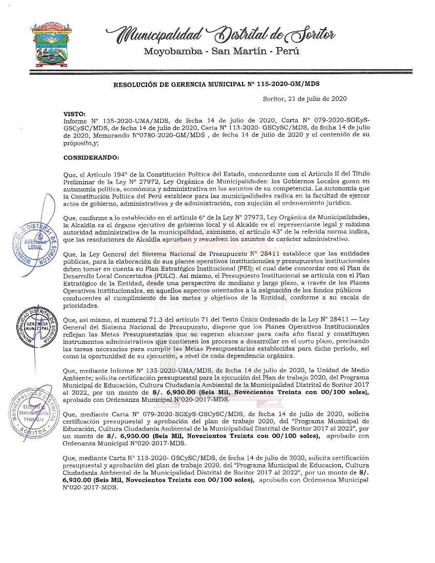 La presente Resolución aprueba el Plan de Trabajo 2020 del Programa Municipal de Educación, Cultura y Ciudadanía Ambiental de la Municipalidad Distrital de Soritor, con la finalidad de definir las actividades de educación, cultura y ciudadanía ambiental que se desarrollarán en la localidad durante el presente año.