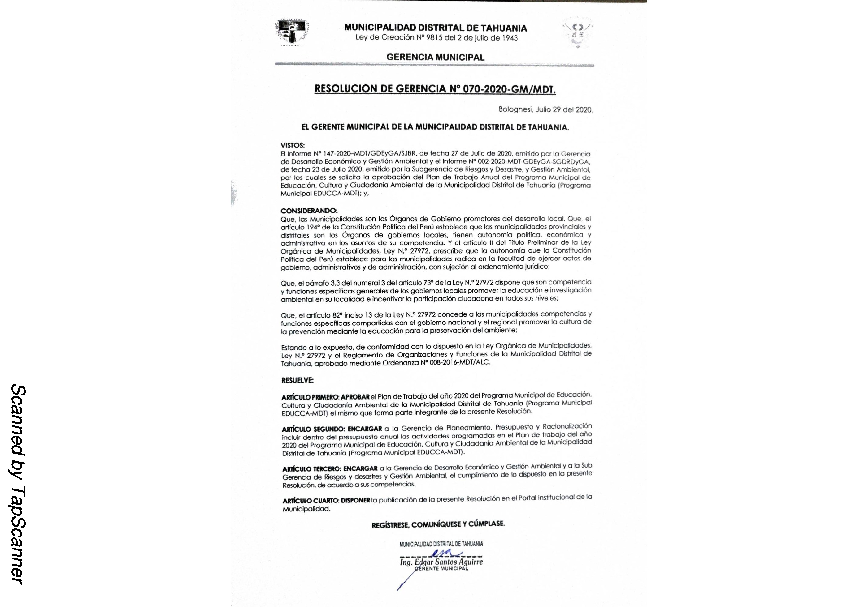 La presente Resolución aprueba el Plan de Trabajo 2020 del Programa Municipal de Educación, Cultura y Ciudadanía Ambiental de la Municipalidad Distrital de Tahuania, con la finalidad de definir las actividades de educación, cultura y ciudadanía ambiental que se desarrollarán en la localidad durante el presente año.