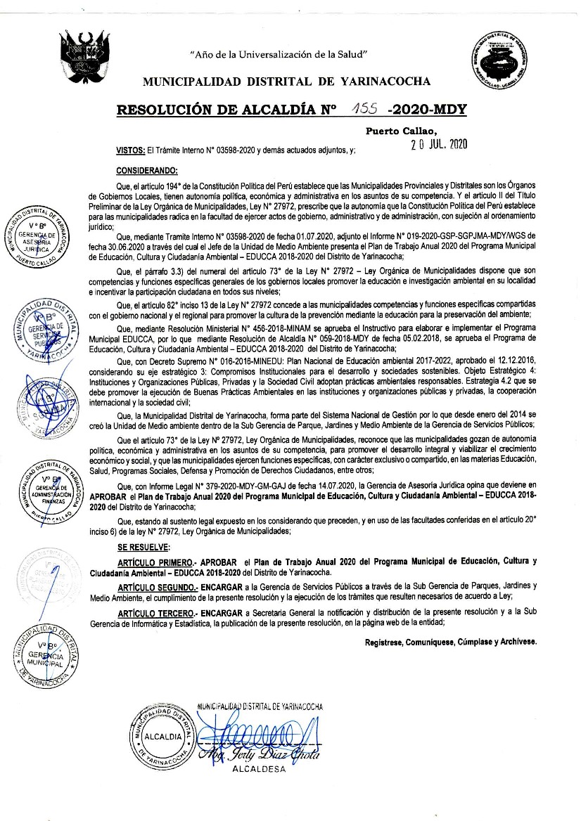 La presente Resolución aprueba el Plan de Trabajo 2020 del Programa Municipal de Educación, Cultura y Ciudadanía Ambiental de la Municipalidad Distrital de Yarinacocha, con la finalidad de definir las actividades de educación, cultura y ciudadanía ambiental que se desarrollarán en la localidad durante el presente año.