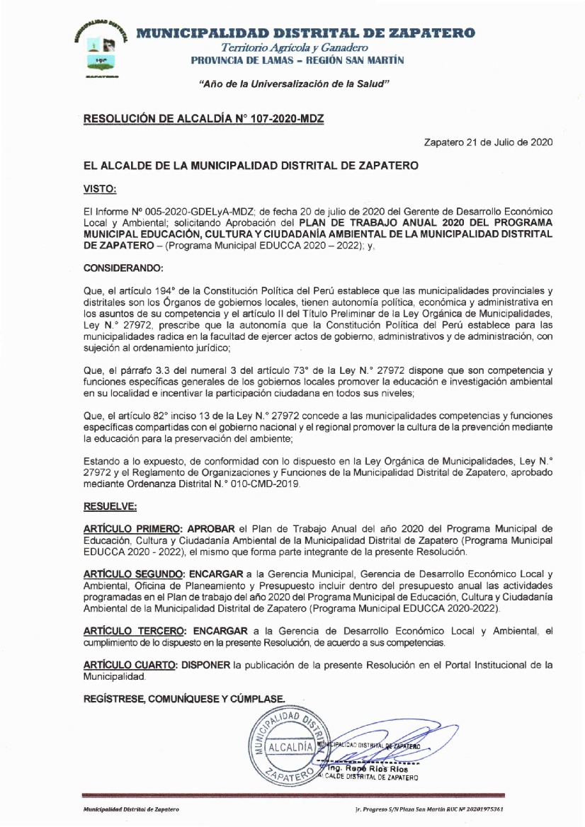 La presente Resolución aprueba el Plan de Trabajo 2020 del Programa Municipal de Educación, Cultura y Ciudadanía Ambiental de la Municipalidad Distrital de Zapatero, con la finalidad de definir las actividades de educación, cultura y ciudadanía ambiental que se desarrollarán en la localidad durante el presente año.