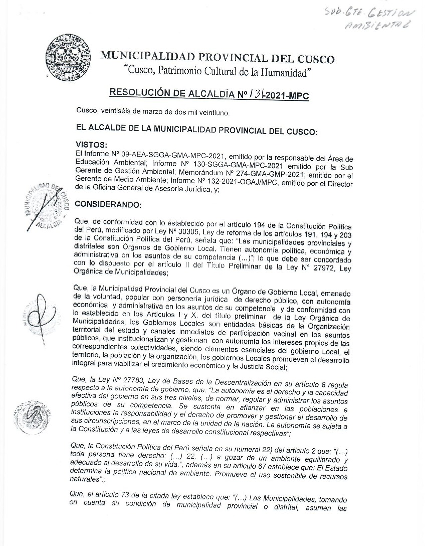 La presente Resolución aprueba el Plan de Trabajo 2021 del Programa Municipal de Educación, Cultura y Ciudadanía Ambiental de la Municipalidad Provincial de Cusco , con la finalidad de definir las actividades de educación cultura y ciudadanía ambiental que se desarrollarán en la localidad durante el presente año.