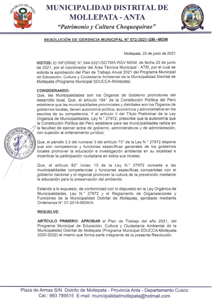 La presente Resolución aprueba el Plan de Trabajo 2021 del Programa Municipal de Educación, Cultura y Ciudadanía Ambiental de la Municipalidad Distrital de Mollepata, con la finalidad de definir las actividades de educación, cultura y ciudadanía ambiental, que se desarrollará en la localidad durante el presente año.